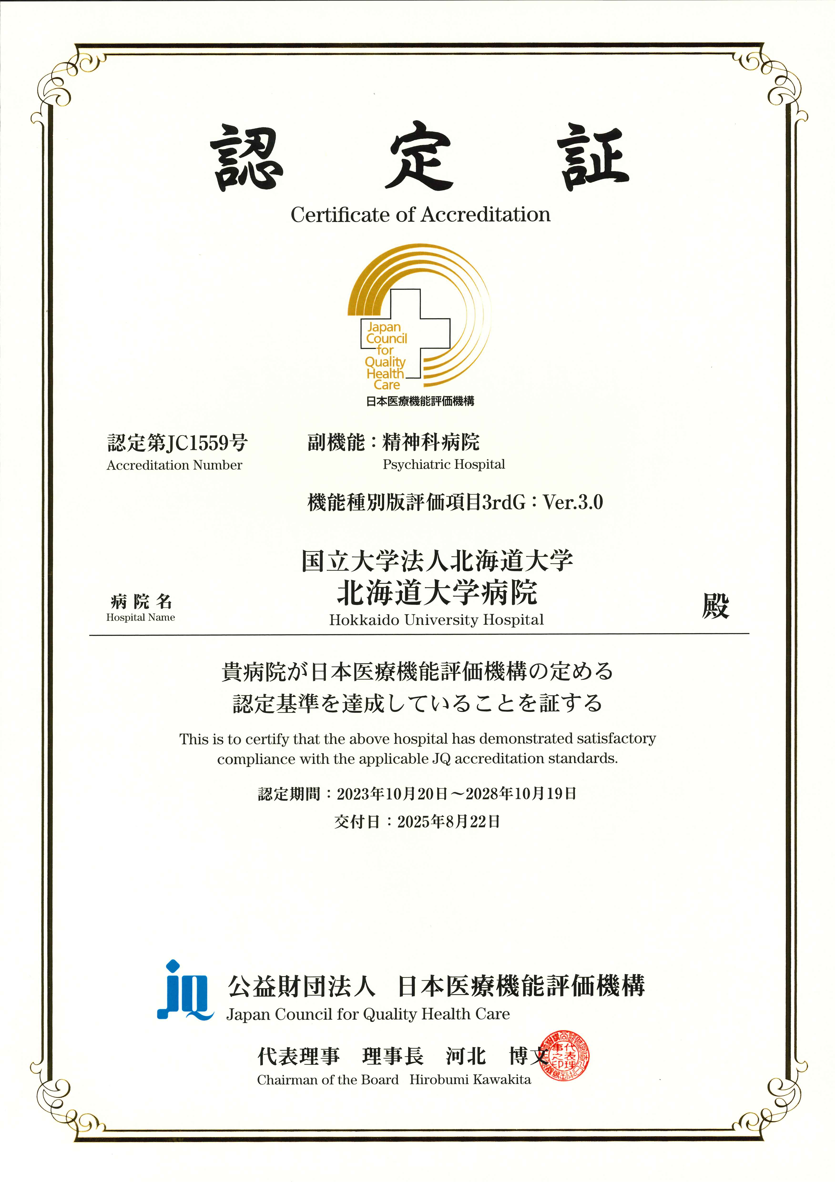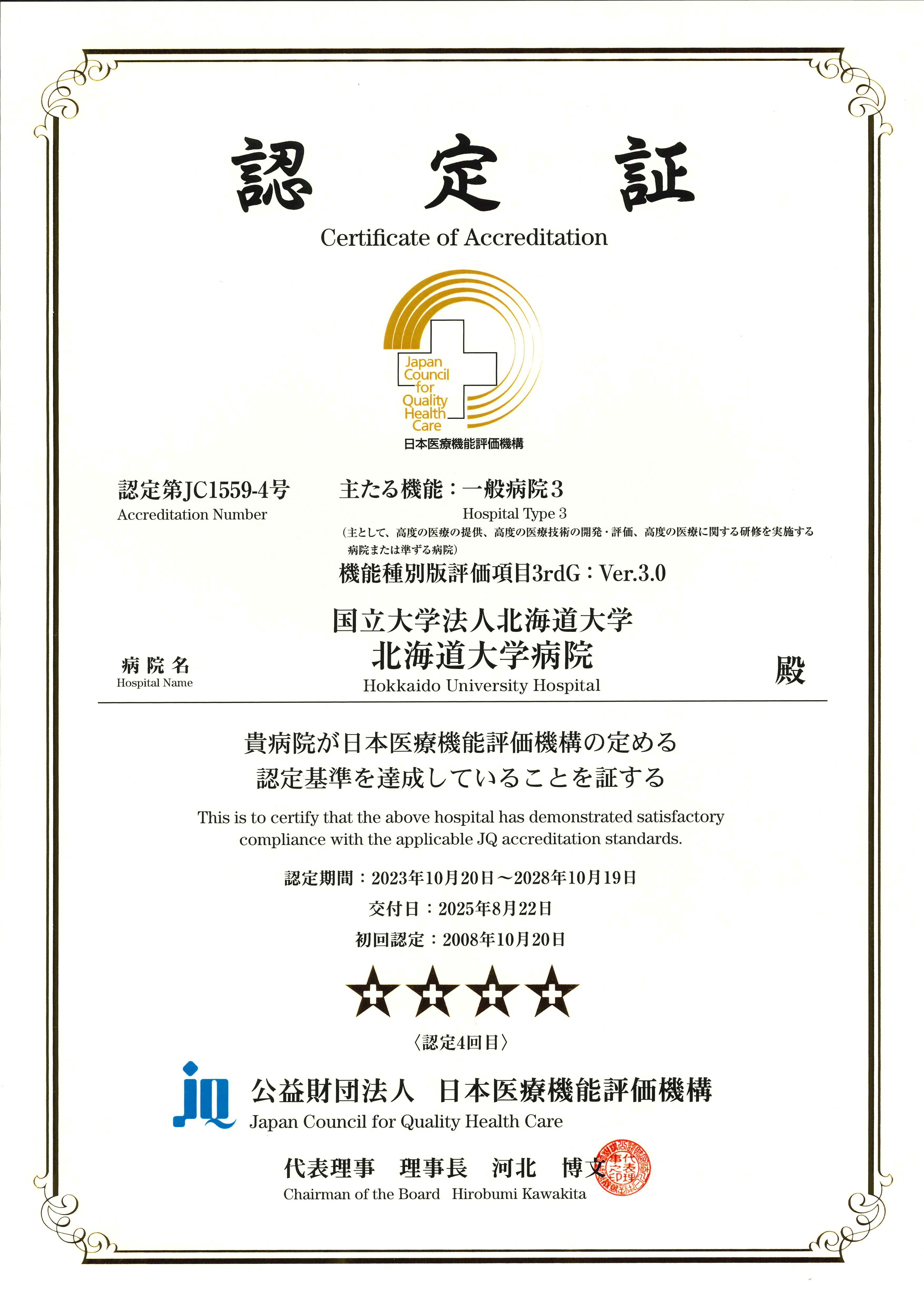 日本医療機能評価機構は、国民の健康と福祉の向上に寄与することを目的とし、中立的・科学的な第三者機関として医療の質の向上と信頼できる医療の確保に関する事業を行う公益財団法人であり、本院は、機構の定める基準に達しているとして、2025年8月22日付けで認定証の交付を受けました。
